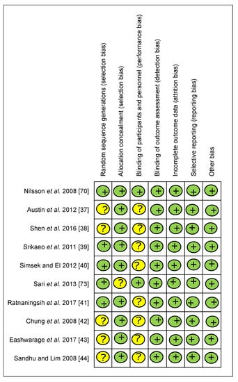- Viswanathan, M.; Ansari, M.T.; Berkman, N.D.; Chang, S.; Hartling, L.; McPheeters, M.; Santaguida, P.L.; Shamliyan, T.; Singh, K.; Tsertsvadze, A.; et al. Assessing the Risk of Bias of Individual Studies in Systematic Reviews of Health Care Interventions; Agency for Healthcare Research and Quality: Rockville, MD, USA, 2012. [Google Scholar]