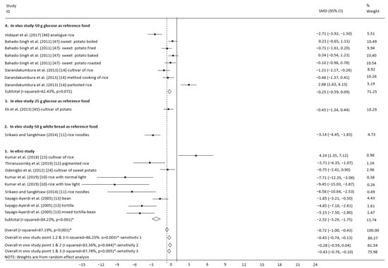 This study used both the in vivo and in vitro methods. This consideration was based on previous studies in which in vitro test results had the same trend as in vivo tests, though in vitro tests tended to have absolute values (overestimation) about 5–25 higher than those of in vivo tests [,,]. That gap was strengthened by the results of the absolute value of SMD chemical properties towards the GI of food, which, in vitro, has a higher value compared to in vivo (Table 4 and Table 6). Other considerations are several theories stating that at least 10 studies must be carried out in a meta-analysis. In the analysis, subgroup analysis and sensitivity analysis are performed. Subgroup analysis was performed based on the variable type of study and reference food. This can provide an overview of two aspects if both methods are used and if only the in vivo method with 50 g glucose reference food os used (Table 6). For in vivo tests, we used and compared only those using 50 g glucose reference food. This is done because the results show that if the reference food is 50 g of white bread or white rice, it is necessary to first convert the GI value with multiplier factors, respectively, 0.77 and 0.69 []. If the reference food used is 25 g glucose, different results would be obtained, which would need to be multiplied by 0.67 as a conversion factor [].