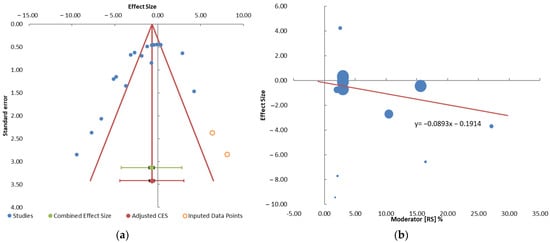 (a) The funnel plot of the effect of differing resistant starch content in carbohydrate foods-to-GI; (b) the meta-regression between resistant starch content (%) and effect size.
