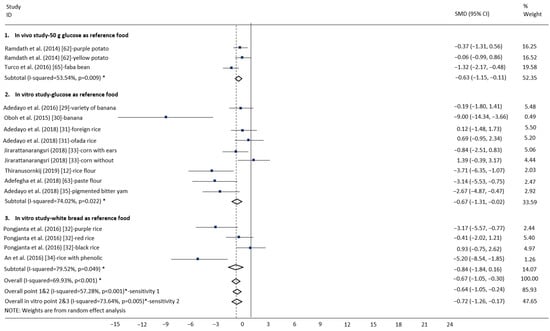 Crop species, i.e., sorghum and red kidney bean, had low GI (respectively, SMD: −0.69, 95%CI: −2.33 to 0.96, p < 0.001; SMD: −0.39, 95%CI: −2.37 to 1.59, p = 0.001), with heterogeneity (respectively, I2 = 81.4%, p < 0.001; I2 = 73.0%, p = 0.001). All results of subgroup analyses are presented in Table 5 and Figure 7.