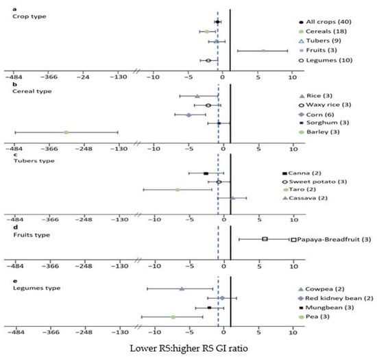 Influence of different crop type (a), cereal type (b), tuber type (c), fruit type (d), and legume type (e) on lower-RS to higher-RS glycemic index ratio in in vitro studies. Forest plot of cumulative effect size and 95% confidence interval (CI) of different crop types comparing lower RS and higher RS on GI. Bold lines indicate the robust model. Only crop type was represented by at least seventeen observations. Values are mean effect sizes with 95% confidence intervals. The number of studies in each class is written in parentheses. The dotted line shows the cumulative effect size across all classes.