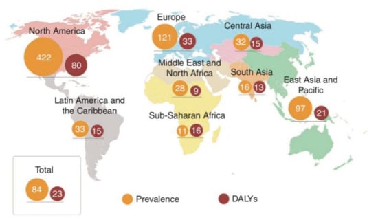 Age-standardized estimates of the regional and global prevalence of IBD (per 100,000 population), as expressed by 2017 disability-adjusted life year (DALY) rates (per 100,000 person-years) [].