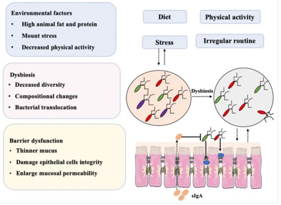 Hence, the intestinal barrier is comprised of structural components (mucus and epithelial cells), immune cells (intraepithelial and submucosal immune cells), and soluble agents (IgA and antimicrobial peptides), which respond to microorganisms []. Any sharp or dramatic changes to the system can alter the intestinal barrier, probably inducing inflammation. The intestinal microbiome is thought to be involved in altering the intestinal barrier by activating intestinal immune cells and epithelial cells to secrete various cytokines, leading to local intestinal and systemic immune responses during IBD.