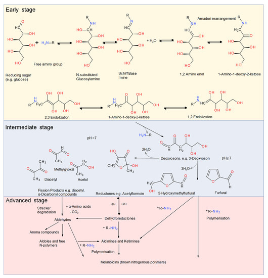 The intermediate stage of the Maillard reaction starts with the degradation of the Amadori/Heyns products. This stage includes dehydration and fission, mainly by dealdolization and Strecker degradation, the interaction of amino acids and dicarbonyl compounds. At neutral or acidic pH, they undergo 1,2-enolization with the subsequent formation of furfural or hydroxymethylfurfural (HMF). At alkaline pH, the Amadori/Heyns products degrade via 2,3-enolization to reductones and a variety of fission products, e.g., acetol, pyruvaldehyde, and diacetyl. All these fission products are very reactive substances that immediately react further [52]. These processes result in a large amount of highly reactive compounds that take part in the further reactions of the advanced or final stage of the Maillard reaction [52]. The course of the final stage of the Maillard reaction depends on reaction conditions such as environment, and involves the dehydration and decomposition of the early reaction products via pathways such as the Strecker degradation [44]. A range of reactions including cyclizations, dehydrations, retroaldolizations, enolizations, oxidations, fragmentations, rearrangements, isomerizations, and further condensations result in the formation of a large amount of compounds that are still poorly characterized [44,47,52,53]. Although some color is produced in the intermediate stage, most of the color is produced in the final stage of the reaction, when melanoidins are generated [47,52,55]. Melanoidins are nitrogen-containing polymers and co-polymers responsible for brown color formation. They have also been shown to affect sensory properties [52,56,57].