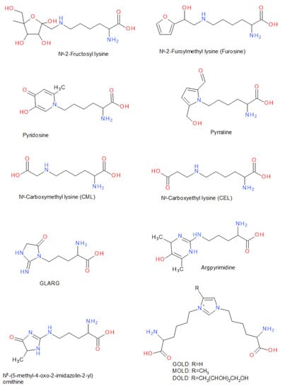 Furthermore, the Amadori products can be formed from the deoxyosones by enolization, dehydration, and deamination. [70]. Due to their reactive α-dicarbonyl partial structure, these substances can further react with amino acid side chains of proteins, e.g., ε-amino group of lysine and guanidino group of arginine and/or other carbohydrate degradation products, such as the fission products glyoxal, glycolaldehyde, methylglyoxal, 2,3-butanedione, or other reactive carbohydrate degradation products, to form various downstream products [71,72,73]. In this late stage of the Maillard reaction, various glycated amino acid derivatives are formed [58,74]. For example, in many processed and heated foods, carboxymethyl lysine (CML) or carboxyethyl lysine (CEL) have been identified as AGEs [75], a reaction product of lysine side chains with glyoxal, glucosone, or of oxidative cleavage of the Amadori product Nε-fructosyl-lysine [63,74,76]. Maltosine (6-(3-Hydroxy-4-oxo-2-methyl-4(1H)-pyridin-1-yl)-l-norleucine), which is a typical substance in the crust of wheat bread (up to 19.3 mg/kg), is formed mainly in the presence of di- and oligosaccharides and glycosylated isomaltol derivatives in the late stage of the Maillard reaction [68]. The reaction with 3-deoxyglucosulose results in pyrraline (ε-2-formyl-5-hydroxymethyl-1-pyrrolyl)-l-norleucine), which can be determined after alkaline or enzymatic hydrolysis by using proteinases such as pepsin and pronase E, and peptidases such as aminopeptidase M and prolidase [60,68,77]. Pyrraline is an indicator in particular for thermally highly stressed foodstuffs such as bakery products or foods that are heated in a dry state [60,78]. It is likely that peptide- and protein-bound pyrraline, which is derived from peptides and proteins, is more widely distributed in foods than free pyrraline, which is derived from free amino acids [60,78]. Besides the ε-amino groups of lysine, the guanidino groups of protein-bound arginine also react with α-dicarbonyl compounds, e.g., to GLARG (1-(4-amino-4-carboxybutyl)-2-imino-5-oxo-imidazolidine), CMA (N7-carboxymethyl-arginine), ornithoimidazoline (Nδ-(4,5-dihydro-5-methyl-4-oxo-imidazol-2-yl)-ornithine), or argpyrimidine (Nδ-(4,6-dimethyl-5-hydroxy-pyrimidin-2-yl)-ornithine) [68,77,79,80]. In addition to the modification of individual amino acid side chains, the formation of cross-linked amino acids was also observed to act as coupling points of carbohydrate-induced protein crosslinks resulting in an oligomerization of, for example, β-lactoglobulin [81,82]. For instance, the reaction of 3-deoxygluco-sulose, glyoxal, and methylglyoxal with two lysine side chains each results in the bis(lysyl)imidazolium salts DOLD, MOLD, and GOLD (Figure 2), which are also advanced glycation end-products [48,58,61]. If oxidation occurs with a glycation reaction, the glycoxidation process may likely generate pentosidine [60]. In contrast, pentosidine is generated in an glycoxidation process by crosslinking the reaction of one arginine and one lysine residue and ribose, but also is formed from Amadori compounds, 3-deoxyosone, and other sugars [60]. When Nα-acetyl-l-arginine in aqueous solution was heated with glyoxal at pH 7.0 in the presence of furan-2-carboxaldehyde, the colored BISARG melanoidin ((S,S)-1-[4-(acetylamino)-4-carboxy-1-butyl]-2-imino-4-[(Z)-(2-furyl)methylidene]-5-azamethylidene-1,3-imidazolidine) was formed by crosslinking two molecules of arginine [56,58,77].