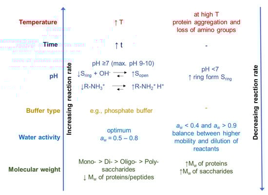 During the glycation of proteins, temperature, time, nature, and concentration of the reactions, as well as pH and water activity (aw), should be controlled in order to be able to influence the yield, quality, and techno-functionality of glycated proteins, and to limit color and off-flavor formation to a minimum [12,85]. A schematic overview of the influence of different environmental parameters on the reaction rate of the Maillard reaction is presented in Figure 3.