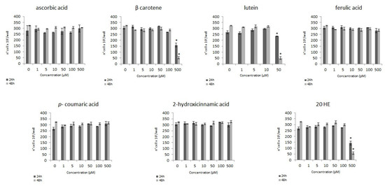 This colorimetric assay allows to evaluate if and to what extent the single phytochemicals tested can affect the proliferation of the HT29 cells, quantifying the number of cells in active proliferation. After 24 h and 48 h of treatment with increasing concentrations (1–500 µM) of ascorbic acid and hydroxycinnamic acids (ferulic-, p-coumaric- and 2-hydroxycinnamic acid) no variations have been found in the number of viable cells comparing treated and untreated samples (Figure 1). However, a significant decrease of cell proliferation has been recorded at the higher concentration tested (500 µM) after treatment with β-carotene, 20-hydroxyecdysone and lutein (Figure 1).