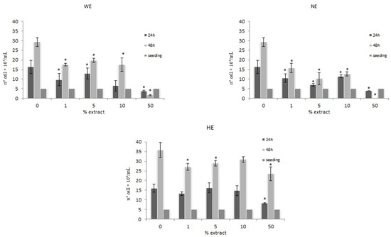 After 24 and 48 h of treatment with increasing concentration (1%, 5%, 10%, 50%) of water (WE) and liquid nitrogen (NE) extracts, data indicate an antiproliferative activity related to highest concentrations.