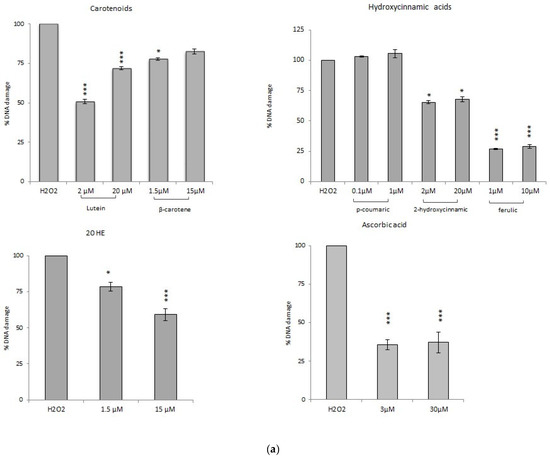 Percentage of reduction of DNA damage induced by H2O2 after a 24 h pre-treatment with different concentration (* p < 0.05; ** p < 0.01; *** p < 0.001): (a) pure phytochemicals; (b) extracts.