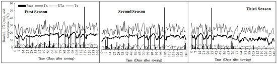 Daily climatic data were obtained from an on-station (within 100 m radius from field experiments) automatic weather station, courtesy of the Agricultural Research Council—Institute for Soil, Climate and Water (ARC–ISCW). Daily minimum and maximum temperature, rainfall and reference evapotranspiration were collected weather station records (Figure 1).
