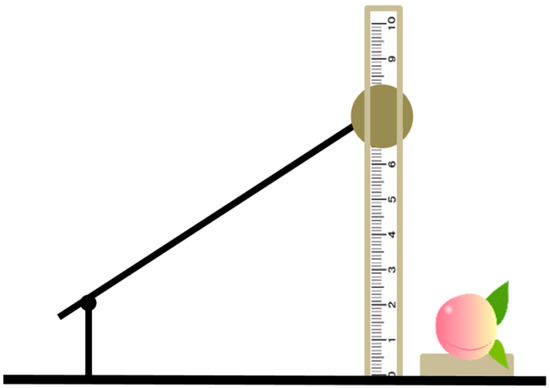 The peaches (cultivar of "Redstar") were hand-picked from the orchard of Southwest Research and Extension Center of Michigan State University (Benton Harbor, MI, USA). The pulp of this cultivar was light yellow, while the peel had mixed yellow-red colors unevenly distributed over the surface [19]. After picking, the peaches were transported to the laboratory immediately and placed in the freezer for further research. The sample-set included 330 peaches from three maturity stages assigned based on fruit firmness by an acoustic firmness sensor (AWETA, Nootdorp, The Netherlands), with 110 fruits for each stage (S1: stage 1, acoustic firmness >30, relatively immature; S2: stage 2, acoustic firmness 20–30, commercially ripe; S3: stage 3, acoustic firmness <20, over-ripeness). Among each set, 100 peaches were used for the detection of their optical properties and the remaining 10 peaches were used for the destructive detection of their microstructures. Before the bruising test, peaches from each stage were analyzed as the intact group. After bruising, the samples were analyzed again at three times to monitor the process of bruising: 0 h after bruising, 4 h after bruising, and 24 h after bruising. The bruising tests of peach were manually performed using a wooden ball weighing 161 g with a 74 mm diameter, and the impact energy is changed by adjusting the drop height of the wooden ball. The ball hit the peaches at the equatorial area, as shown in Figure 1. In this research, the impact energy was 0.4 J with a fixed falling height of about 22 mm, which could not clearly observe the damage immediately after bruising. A detailed description of the impact test is given in Zhu et al. [20]. Therefore, there were a total of 12 groups in this research (3 maturity levels × 4 detection times), and the samples were defined as shown in Table 1, each group contained 100 samples.