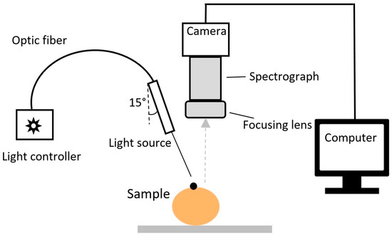 The optical properties of the fruit samples were measured based on the principle of spatially resolved spectroscopy. A detailed description of the principle and parameters of the instrument is given in Cen and Lu [21] and Sun et al. [6]. Figure 2 shows the scheme of a bench-top optical property measurement prototype that was developed in-house based on the spatially resolved spectroscopic principle and coupled with a hyperspectral imaging technique in line-scanning mode to measure the optical properties of the fruit [15,19]. Peaches from each group were measured using this system (Figure 2).