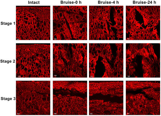 Confocal laser scanning microscopic images of a cross-section of intact and bruised peach flesh tissue for three maturity stages (stage 1–3) and three detection times after bruising (the white ruler shown in the image represents 100 μm).