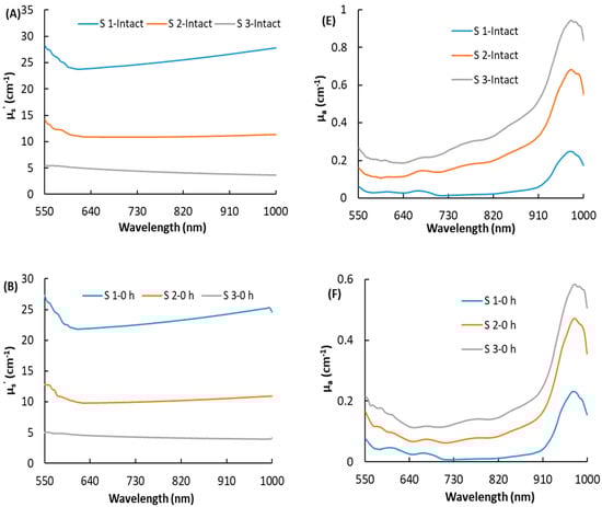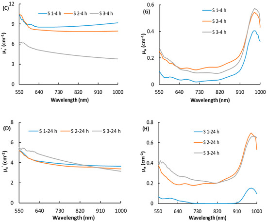 Figure 4 shows the effect of maturity on optical properties following different times after bruising. The μs′ curve decreased first and then flattened over 550–1000 nm with no characteristic peaks. For the immature peaches (S1), the μs′ value increased over 550–1000 nm, while for the overripe peaches (S3), the μs′ value decreased over 550–1000 nm. However, the changes in μs′ among the different maturity stages were still quite large; μs′ decreased as the peach matured. Different from μs′, the μa varies greatly with wavelength, and two absorption peaks were observed around 675 and 970 nm. The prominent peak at approximately 970 nm was ascribed to the second overtone O-H stretching from water [24]. However, the absorption peak at 675 nm, which was reported as the absorption of chlorophyll-a [19], was not obvious in this research. A possible explanation is that this ‘Redstar’ peach has a low chlorophyll-a content in the red skin. The changes in μa among the different maturity stages were opposite to the changes in μs′, in that μa gradually increased as the peach matured. It can be seen from Figure 4A, E that for the S1 samples, the values of μs′ were much larger than the values of μa, which means that the diffusion approximation equation is satisfied (μs′ >> μa). As peach overripeness or bruising occurs, they both cause tissue softening, leading to cell wall depolymerization, increased solubility of the gelatin layer, and separation of the cytoplasmic wall. At this time, μs′ rapidly decreased, and the assumption of scattering domination for the diffusion approximation equation may no longer be valid, which means that the calculated values of μa and μs′ may not accurately reflect the true values of the sample, the same results also reported in Cen et al. [14] and Sun et al. [6]. This is also a possible reason why the spectral curves of μa in Figure 4G,H were abnormal.