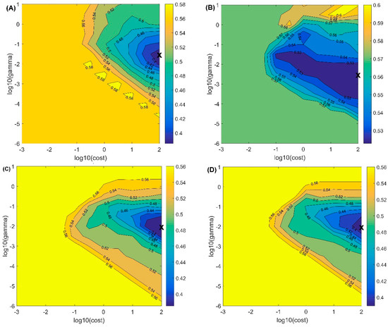 The misclassification fraction of cross-validation for the SVM model based on µa (A), µs’ (B), µa × µs’ (C), and µeff (D).