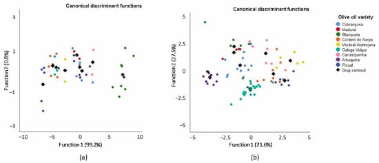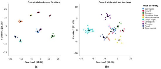 Linear discriminant analysis (represented by canonical discriminant functions) of the olive oils from 2016 (a) and 2017 (b), categorized into nine groups according to variety, based on significantly different 1H NMR signals.