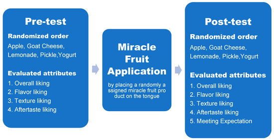 Just before the start of the pre-test, the panelists were instructed to drink a sip of distilled water that was at the same temperature as the food samples and to wait for at least 30 s. When they were ready, the panelists began to evaluate the first assigned food sample. After all of the evaluations were performed for one sample, and if nothing remained inside of their mouths, the panelists evaluated the next sample. After completing the pre-test, panelists took a 5-min break and proceeded to miracle fruit administration. For the miracle fruit administration, the panelists were instructed to drink a sip of water, wait 30 seconds, and place a miracle pill or powder on their tongue and roll it around very slowly. After the miracle fruit product was melted, the panelists were allowed to start a post-test. In the post-test, the same order of sample testing that was randomly assigned to each panelist in the pre-test was used.