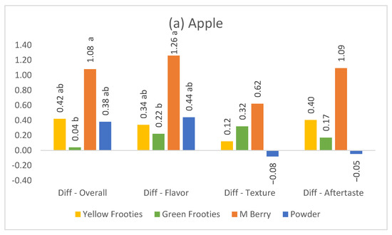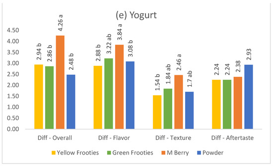Means of the difference between pre and post-test liking intensity for food samples, (a) apple, (b) goat cheese, (c) lemonade, (d) pickle, and (e) yogurt on miracle fruit products (Yellow Frooties—Y, Green Frooties—G, M Berry—M, and Powder—P, product details given in Table 1). Means in the same liking attribute labeled with the same letter are not significant different (Tukey HSD test, p < 0.05).