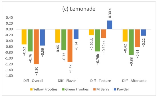 | Lemonade | Pre—Overall | 6.3 b | 6.6 ab | 7.3 a | 6.9 ab |