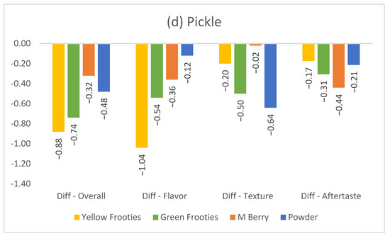 Overall, lemonade and pickle had a similar degree of liking decreases after using the miracle fruit products, but a slight difference could be observed between the results of the two food products (Figure 2). For both products, overall liking and flavor liking results exhibited similar patterns and similar degrees of decrease. Thus, it can be assumed that flavor had a direct impact on overall liking. However, it is interesting that the two products exhibited opposite texture liking results for the powder miracle fruit product, with the effect being that lemonade exhibited a liking increase, whereas pickle exhibited a liking decrease. As shown in the consumer panel’s comments in the present study, they did not dislike the additional powdery texture in lemonade; rather, they provided favorable feedback on the texture liking of lemonade because consumers may have been familiar with a powdered lemonade mix product. However, for pickles, consumers commented that the powdery texture of the miracle fruit-treated pickle bothered them because powdery texture in pickles is unexpected and undesirable.