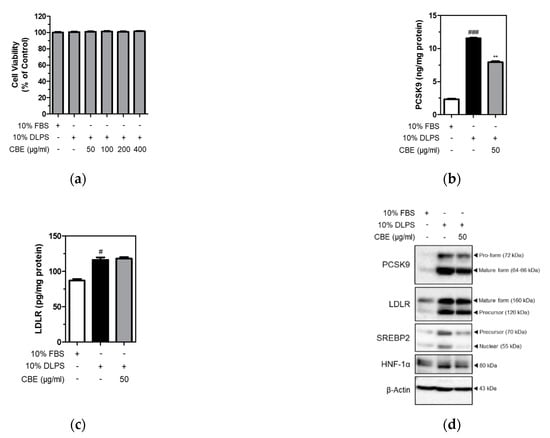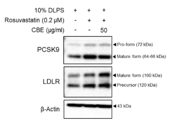 3.2. CBE Significantly and Markedly Suppressed the Levels of Intracellular PCSK9, but Not LDLR, in HepG2 Cells under Lipid Depletion Conditions