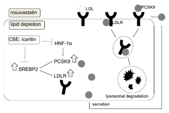 - Dong, B.; Wu, M.; Li, H.; Kraemer, F.B.; Adeli, K.; Seidah, N.G.; Park, S.W.; Liu, J. Strong induction of PCSK9 gene expression through HNF1alpha and SREBP2: Mechanism for the resistance to LDL-cholesterol lowering effect of statins in dyslipidemic hamsters. J. Lipid Res. 2010, 51, 1486–1495. [Google Scholar] [CrossRef] [PubMed]