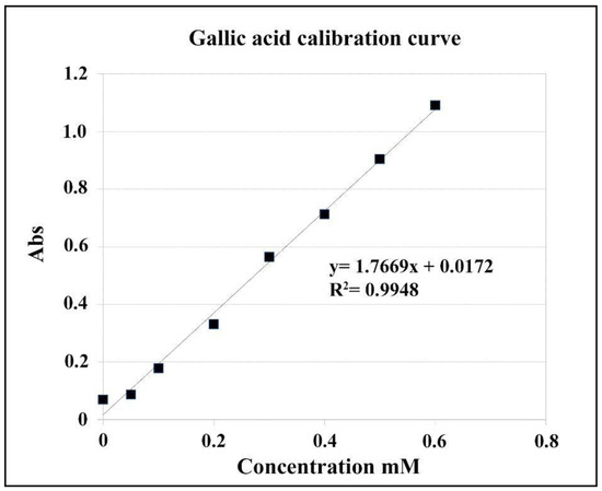 Total phenol content was determined by the Folin–Ciocalteu method [11] using gallic acid (GA) as per the recommended standard [12]. From these solutions, an aliquot of 0.5 mL of methanolic extract was taken and 2.5 mL of the Folin–Ciocalteu reagent was added and it was left to react for 3 min, then 2 mL of Na2CO3 solution was added and mixed in a shaker (Heidolph, Berlin, Germany). The solution was incubated at a temperature of 40 °C in a dark stove for 1 h. The absorbance was measured at 765 nm using a spectrophotometer and the results were expressed in gallic acid equivalents, using a gallic acid (0.05–0.5 mg/mL) standard curve (Figure 1). To prepare a calibration curve 0.017 g of gallic acid was added, as control or standard, into 100 mL volumetric flasks, and then diluted to a volume of 100 mL with water. These solutions will have a known phenol concentration of 1 mM of gallic acid, the effective range of the assay (Table 2).