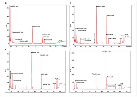 Chromatograms of the studied samples: phenolic acids and fatty acids. (a): Tinto river territories, samples 1–3, 6–9; (b): Odiel and Piedras river territories, samples 4–5; (c): mainland territories, samples 10–13; and (d): mainland territories, Valladolid, sample 11.