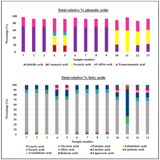 In the material from the Tinto river coastal saltmarsh in the Iberian southwest, salicylic acid stands out with more than 60% relative content. Samples from the mainland territories present no more than 22% (Figure 2 and Figure 3, and Table 4).