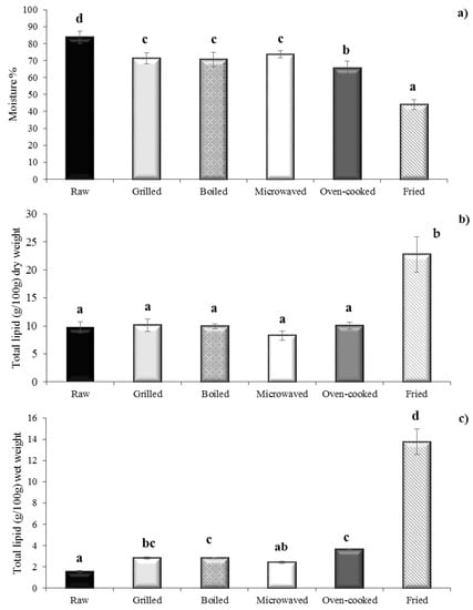 (a) Moisture percent (%), (b) lipid content (mg/100 g dry weight basis) and (c) lipid content (mg/100 g wet weight basis) of raw and cooked mussels (Mytilus galloprovincialis). Different letters over bars indicate significant differences among means (p < 0.05).