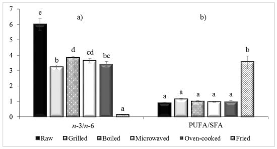 Some researchers consider the ARA/EPA ratio as a better nutritional quality index than the n-3/n-6 ratio. An increase of the ARA/EPA ratio reduces the nutritional value of the product [53]. All cooking methods investigated in this study had a significant effect on this index, from 0.25 in raw sample to the highest value in grilled sample (0.46) (p < 0.05) (Table 4).