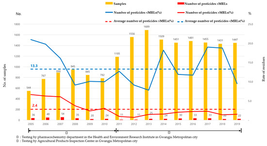 Samples analyzed by the monitoring programs of pesticide residues (Gwangju Metropolitan City) from 2005 to 2019: Trends in the annual number and percent (pesticides residues < MRLs and > MRLs).