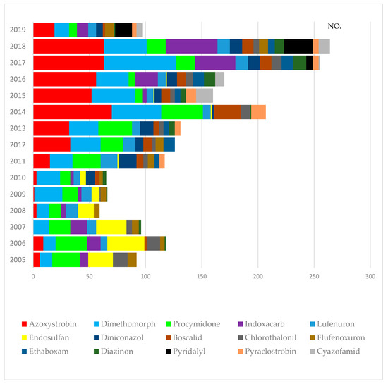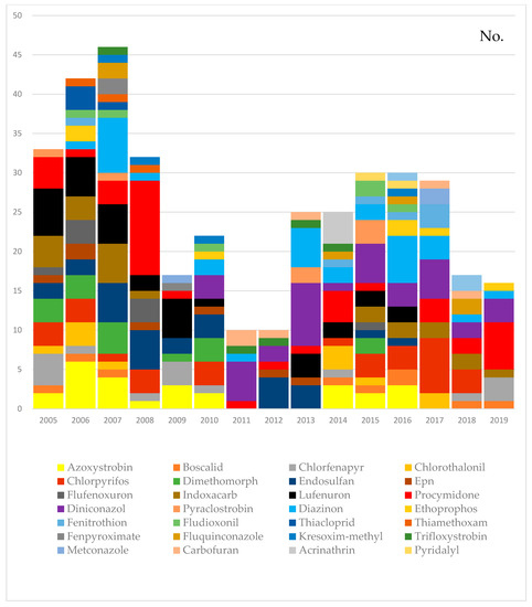 In 2.389 samples, we detected pesticide levels below the MRLs. Table 4 summarizes the main pesticides detected in leafy vegetables. Azoxystrobin (17.8%, 425/2.389), dimethomorph (16.5%, 393/2.389), procymidone (11.3%, 271/2.389), indoxacarb (6.7%, 160/2.389), and lufenuron (5.1%, 122/2.389) were the most frequently detected pesticides (with low MRLs). These types of pesticides account for nearly 58% of the total amount. However, Figure 2 shows that these values changed over the long term. The most frequently detected azoxystrobin was rarely detected before 2010. The detection increased after 2011, and it was frequently detected until 2018. Azoxystrobin is a broad-spectrum systemic fungicide of the class of methoxyacrylates (ARS 2008) [23]. Some pesticides, such as procymidone and endosulfan, were frequently detected, but our results show that their concentrations have decreased in recent years. Pesticides such as procymidone, widely used in South Korea, are managed through farm management by concerned authorities (The National Agricultural Products Quality Management Service, county offices, and district offices). Therefore, it seems that the frequency of detection of procymidone has decreased compared with that in the past. Endosulfan is a harmful agrochemical as an organochlorine insecticide and acaricide due to its acute toxicity and potential for bioaccumulation. Further, it is considered as a potential endocrine disruptor [24]. A worldwide ban on the production and use of endosulfan was agreed under the Stockholm Convention in April 2011 [25]. Since 2011, endosulfan has been banned from being manufactured and used in South Korea. The management system has been strengthened since 2015, as it was included in the Korean persistent organic pollutants (POPs) [26]. As shown in Figure 2, the use of endosulfan decreased after 2011. Despite the ban on the use of endosulfan, one detection per year in 2011 and 2014–2016 was made based on our research. Based on these results, these pesticides need to be managed continuously via official monitoring programs in case they are used. Indoxacarb was detected before 2014, from 2005 to 2010. It was not detected from 2011 to 2014 and has been detected again since 2015 (4–36 times per year). Pyridalyl was detected for the first time in our tests in 2017, and its detection (6–26 times per year) has increased in the last three years (2017–2019).