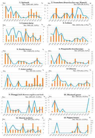 Annual distribution by which the MRLs are exceeded in the main leafy vegetables analyzed from 2005 to 2019 (blue lines—the nonconformity rate of samples, orange bars—the number of nonconformities of samples).