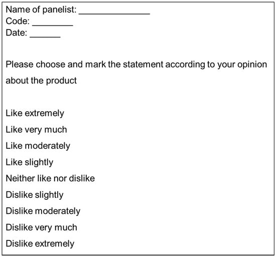 The hedonic method offers an assessment of the liking of the product being tested, using hedonic scales (9-pt hedonic) [15] (Figure 1). In this scale, the panellists have to choose the expression more in relation to their perception and acceptance of the product. The use of this type of scale allows us to transform this answer into a numerical value, for example, 1 = dislike extremely to 9 = like extremely. This type of evaluation provides quick information on the capacity and potential for success of the new developed product. Hedonic tests can also provide information of the various cluster of consumers for different products, different textures, different composition, etc. These results would help to better understand the justification for liking or disliking a product [5]. However, this technique also has some limitations, such as: The number of necessary panellists (representative consumers), and the atmosphere and circumstances, that should be similar to the real situations in which consumers would find themselves. Usually, more than 60 representative consumers are used. It should be taken into account that the result of this type of test is not indicative of the consumer purchase intention, as other types of factors, apart from the linking, influence it. Assessing the purchase intention requires a greater number of participants (usually more than 100).