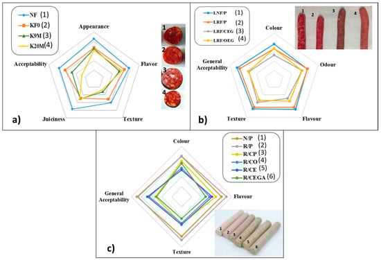 Example of sensory analysis results obtained in studies based on the improvement of the lipid content in meat products: (a) Dry fermented sausages (adapted from Jiménez-Colmenero et al. [59]; (b) fresh sausages (adapted from Pintado et al. [58]; (c) cooked sausages, frankfurter type (adapted from Pintado et al. [54]).