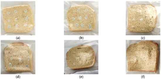 The microbial shelf life was determined, according to Doulia et al. (2009) [27]. The contaminated loaves were visually analyzed daily. Shelf life ended when the growth of P. commune was detected on the surface because consumers would reject the product at the first sign of spoilage.