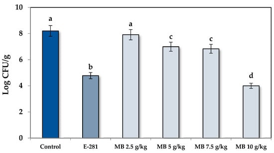 Regarding the fungal population (FP), the shelf life results were corroborated by counting the fungal colonies of the bread slices at day 7 of incubation. Likewise, as plotted in Figure 2, the bread elaborated with MB at 2.5 g/kg did not significantly reduce the FP regarding the control treatment (p < 0.05). However, statistically, significant differences were observed for MB at 5 g/kg and 7.5 g/kg. Specifically, the FP was reduced by 1.21 and 1.37 log CFU/g compared to the control treatment, which meant a reduction of 96.1 and 97.3%, respectively. The most effective dose was 10 g/kg of MB, which reduced the FP by 4.20 Log CFU/g (99.9% reduction), and it also equaled the effectiveness of the treatment with additive E-281. The data obtained showed that MB is a potential candidate for a preservative ingredient in bakery products affected by the genus Penicillium. Therefore, its incorporation into the bread dough could avoid fungal growth and, consequently, increase the shelf life and the safety of these foods.
