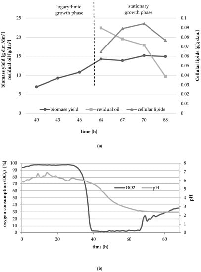 The main purpose of the experiment was to attempt the ex novo synthesis of single cell oil in a medium containing waste fish oil in Y. lipolytica batch culture. Biomass yield and content of microbial oil in yeast were determined in biomass collected between 64 and 88 h of culture which corresponded to late logarithmic and early stationary growth phases. Figure 1a,b show the growth of yeast culture in medium with waste fish oil as a carbon source. The culture was characterized by a very long adaptation phase (about 37 h), and dry biomass yield in 40 h of culture, i.e., in the initial logarithmic phase was 7 g d.m./dm3. During the experiment biomass yield increased, reaching the highest value in 70 h of culture (15.16 g d.m./dm3). The content of microbial oil also changed over time (Figure 1a). After 64 h the lipid yield amounted 0.065 g/g d.m. and after 70 h of culture the highest lipid yield was measured (0.094 g/g d.m.). Extending the culture to 88 h caused a slight decrease in the dry biomass yield (14.92 g d.m./dm3) and in the cellular lipids content (0.077 g/g d.m.). The decrease in the content of microbial oil in cells may be caused by its partial consumption and use for energy purposes by β-oxidation of fatty acids []. At the beginning of stationary growth phase there was observed almost half of the carbon source added at a culture starting point (Figure 1). Even though, the biomass yield did not change significantly in the growth phase, waste fish oil was still being consumed for SCO synthesis.