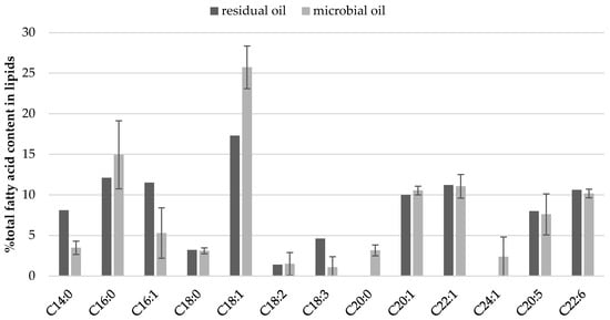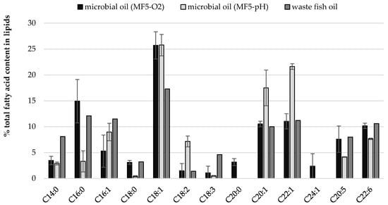The impact of culture conditions such as pH and oxygen regulation on fatty acid profile of cellular lipids (Figure 2 and Figure 3) was investigated. Some general regularities were observed like twice lower content of C14:0 in SCO than in fish oil, but 10% lower content of oleic acid (C18:1). Once again, independently from culture conditions, high contents of very long chain fatty acids (VLCFA) were quantified in yeast biomass including EPA, DHA, eicosenic and erucic acids (Figure 2). Moreover, the yeast cells accumulated proportionally FFA from carbon source and slight differences can be observed for their content in storage lipids and waste fish oil medium (Figure 3). What is characteristic, apart from culture conditions, the fatty acids profile in lipids extracted from Y. lipolytica cells grown in oxygenated waste fish oil medium (MF5-O2) and cultured with regulated pH (MF5-pH) reflected the profile of FFA in waste oil (Figure 2, Table S1).