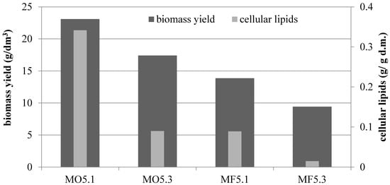Decreasing the amount of inoculum had a positive effect on the culture parameters in MO5 and MF5 media. In the olive oil medium, the content of cellular lipids reached the value of 0.341 g/g d.m. (when the lower volume of inoculum culture was used—0.025% v/v) and this result was almost four times higher than the one obtained for culture inoculated with 0.075% v/v (0.090 g/g d.m.) (Figure 4). When using waste fish oil as a sole carbon source in culture, this difference was even greater, because a 6-fold increase in the amount of accumulated lipids was observed (0.089 g/g d.m.). In the waste fish oil medium the trend was similar and 13.85 and 9.43 g d.m./dm3 were obtained, respectively.