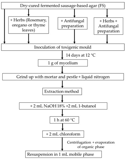 Flow chart showing the assay to check the suitability of the developed methodology for extracting and quantifying ergosterol when determining the effect of antifungal agents against meat product-borne toxigenic moulds. Mobile phase was composed of methanol/acetic acid 0.05% (v/v) 95/5 (v/v).
