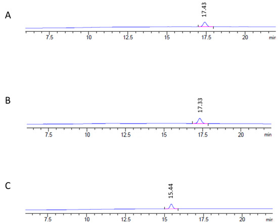 High-performance liquid chromatography with fluorescence detection coupled to a diode array detector (HPLC-FLD/DAD) chromatograms using an ergosterol standard (10 µg/mL) and the three different mobile phases tested in the present work. (A) Mobile phase 1, composed of methanol/acetic acid 0.05% (v/v) 90/10 (v/v); retention time: 17.43 min. (B) Mobile phase 2, composed of methanol/acetic acid 0.1% (v/v) 90/10 (v/v); retention time: 17.33 min. (C) Mobile phase 3, composed of methanol/acetic acid 0.05% (v/v) 95/5 (v/v); retention time: 15.44 min. Eluent A was composed of the corresponding mobile phase, and Eluent B of methanol. The gradient consisted of 0–5 min 10% B, 5–8 min linear increase from 10% to 100% B, 8–12 min 100% B, 12–22 min linear decrease from 100% to 10% B, with methanol being used as eluent B.