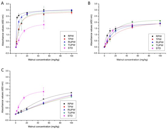 The test was carried out according to the manufacturer’s instructions with minor variations (Biomedal Diagnostics, Sevilla, Spain). One hundred microliters of undiluted or diluted (1:5, 1:10, 1:25 in protein extraction buffer) sample extract or controls were added to the wells of the provided coated plate for walnut specific antibody. After 20 min incubation at room temperature (25 °C), the wells were washed ten times with 200 μL of 1X washing solution. Then, 100 µL of conjugate solution was added to the wells, incubated for 20 min at room temperature, and washed again. Following 20 min incubation with 100 μL of substrate solution, 100 μL of stop solution were added, and the yellow signal was measured at 450 nm in a spectrophotometer (FLUOstar Optima, BMG Labtech, Ortenberg, Germany). A negative extraction control (without sample) and the 0 mg kg−1 standard were included in all trials, and each sample was analyzed in duplicate. The limit of detection (LOD) and limit of quantification (LOQ) were calculated as the concentration of the target protein that presents an absorbance value higher than the blank (corn flour) plus 3 or 10 times, respectively, its standard deviation [14]. A concentration–response curve using the standards provided by the kit was generated by plotting the absorbance values vs. the walnut concentration. The standard curve obtained was fitted to the four-parameter logistic equation using Origin 8.0 software (OriginLab Corp., Northampton, MA, USA) and compared with curves obtained plotting the RPW, TPW, RUPW, and TUPW absorbances undiluted or diluted 1:5 or 1:25 with protein extraction buffer. Cross-reactivity of the assay was calculated for eight tree nuts and soybean, as the amount of walnut estimated by interpolating the absorbance values of undiluted extracts in the logistic equation obtained with the kit calibrants.