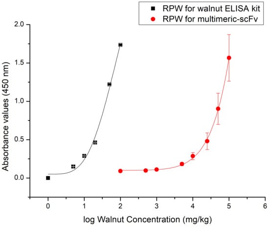 The binary mixtures made with raw peeled walnut in corn flour were analyzed with the walnut ELISA kit and multimeric scFv ELISA to compare performance (Figure 2). The results obtained confirmed that the LOD of the polyclonal antibody ELISA kit is three logarithmical units lower than that of the recombinant antibody-based ELISA.