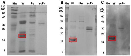 SDS-PAGE electrophoresis (A) and JrBSF scFv immunoblots (B,C) of 10 µg walnut extract (W), 10 µg pecan extract (Pe), and 2 µg purified JrBSF (scFv). Mw of the protein marker bands (ColorBurstTM Electrophoresis Protein Marker, Sigma) is indicated. JrBSF scFv in the immunoblots was detected either with Anti-c-Myc monoclonal antibody (9E10) and alkaline phosphatase (AP) conjugated anti-mouse IgG (B) or with horseradish peroxidase (HRP) conjugated Anti-6X His tag® antibody (ab1187) (C).
