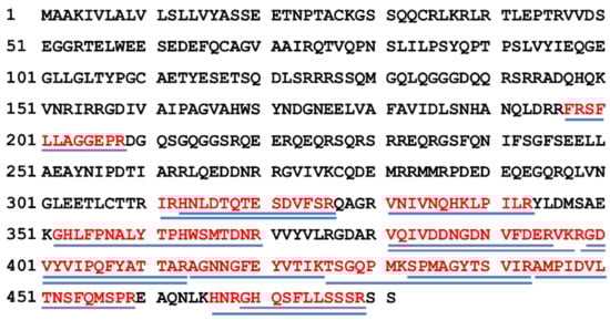 A proteomic approach was used to confirm the identity of the protein band recognized by the antibody. Nineteen peptides of the 11S globulin seed storage protein 2-like (Jug r 4) from Juglans regia (Accession Number: XP_018818401.1) were identified by MALDI-TOF/TOF (Table 3) in the electrophoretic band, with 31% of sequence coverage (Figure 4).