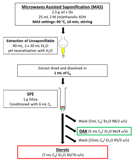 It appears evident that the optimization of a robust and validated procedure for more rapid characterization of oils and fats is necessary. This paper aims to provide a flexible method exploiting MAS to efficiently and rapidly performed the sample saponification, followed by a lab-made SPE to isolate the fraction of interest. In this context, sterols and dialkyl ketones (DAK) have been targeted.
