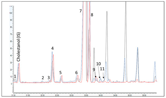 GC-FID trace chromatogram of the sterol fraction obtained using the IOC method (red trace), the first optimized method where the sterol fraction was eluted after 5 mL of hexane/Et2O (88/12, v/v) (black trace) and the final conditions (blue trace). Identification as for Table 1.