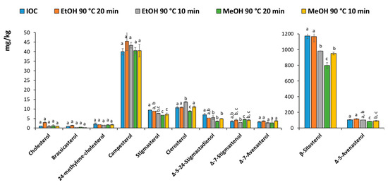 Barplot of the sterols using the IOC method or the different MAS saponification followed by SPE. Same letter indicates no significant difference.